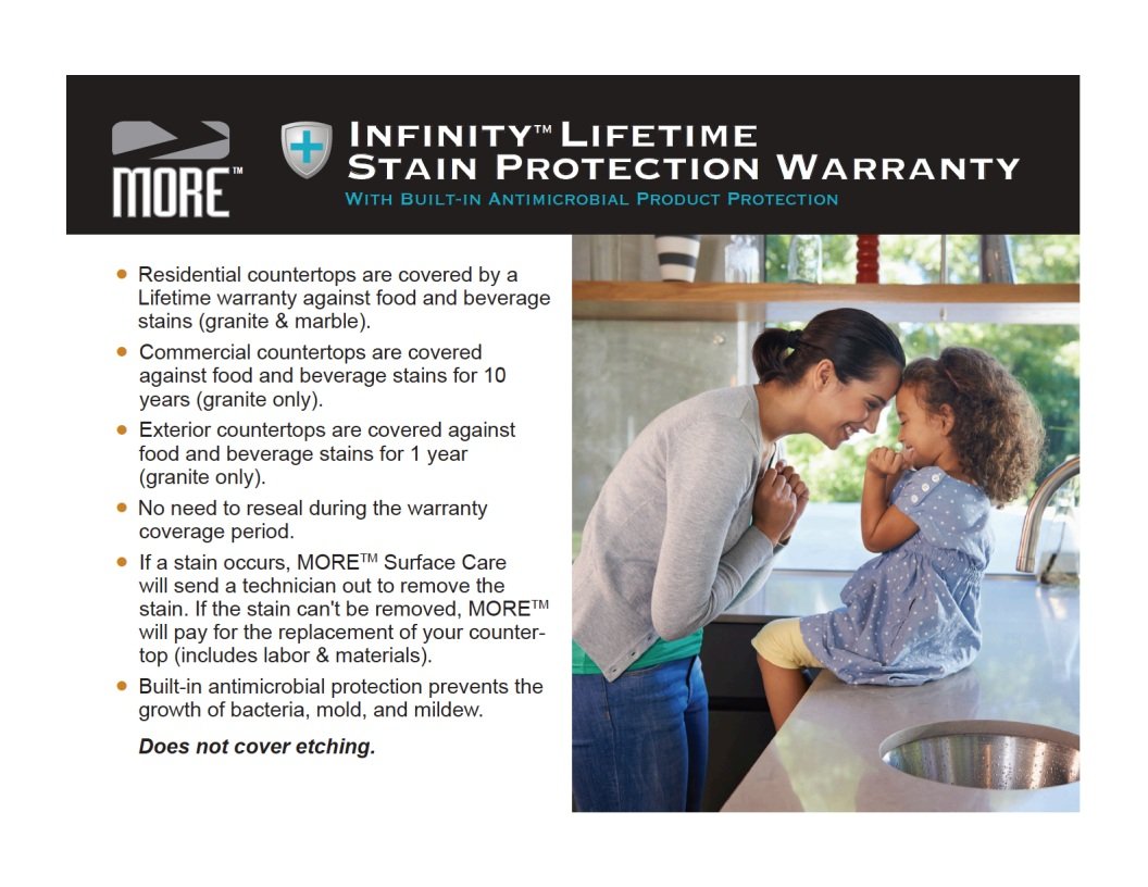 The MORE® Infinity Lifetime Warranty Program provides that extra level of protection for granite and marble. Having a stain protection warranty gives you peace of mind when it comes to protecting your countertop investment with a full countertop replacement, not a new bottle of sealer.